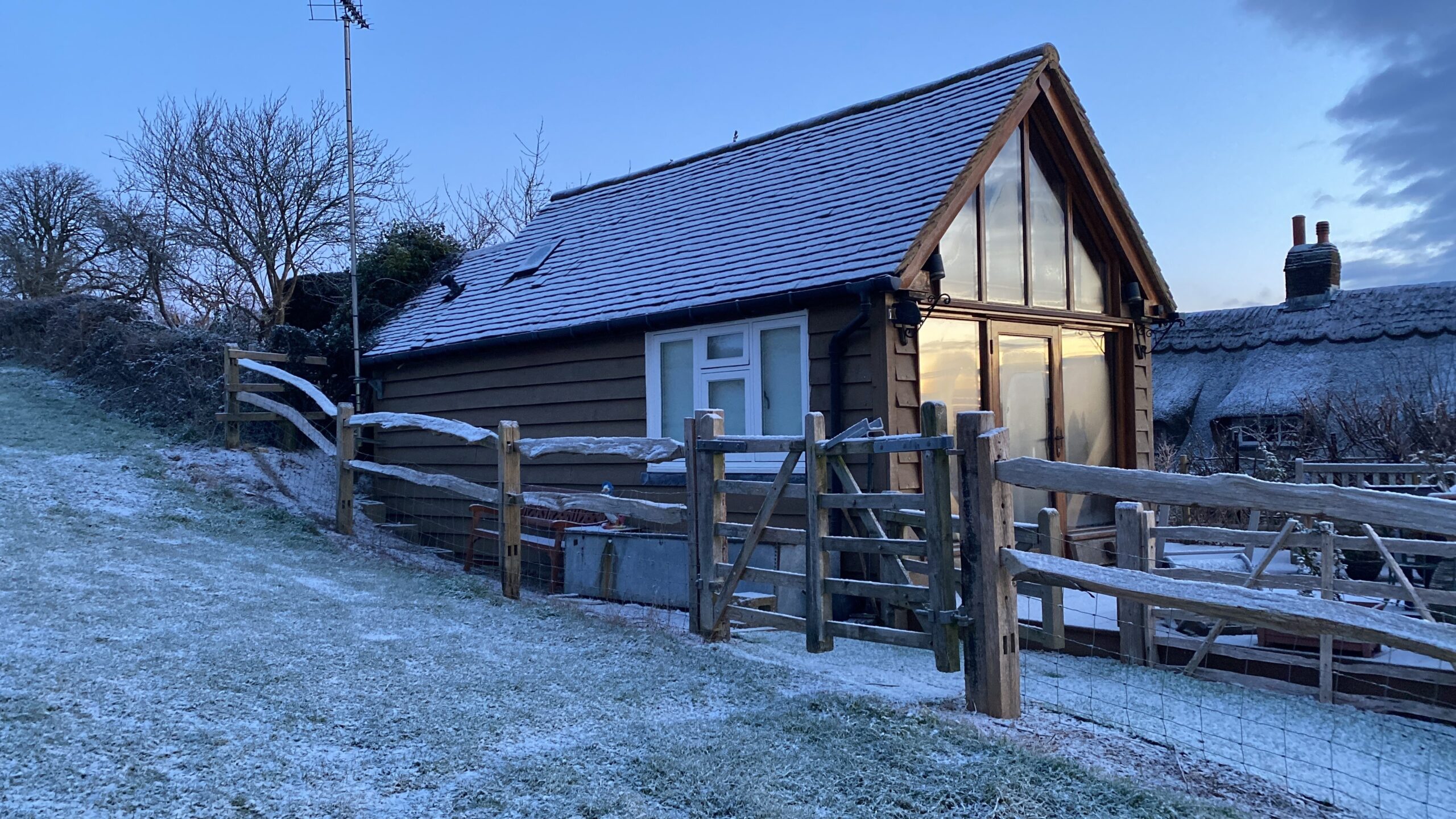 The Observatory is a detached studio room that sits in an elevated position adjoining the A Barn. The property is accessed from the car park by garden steps. It has extensive views in 3 directions.